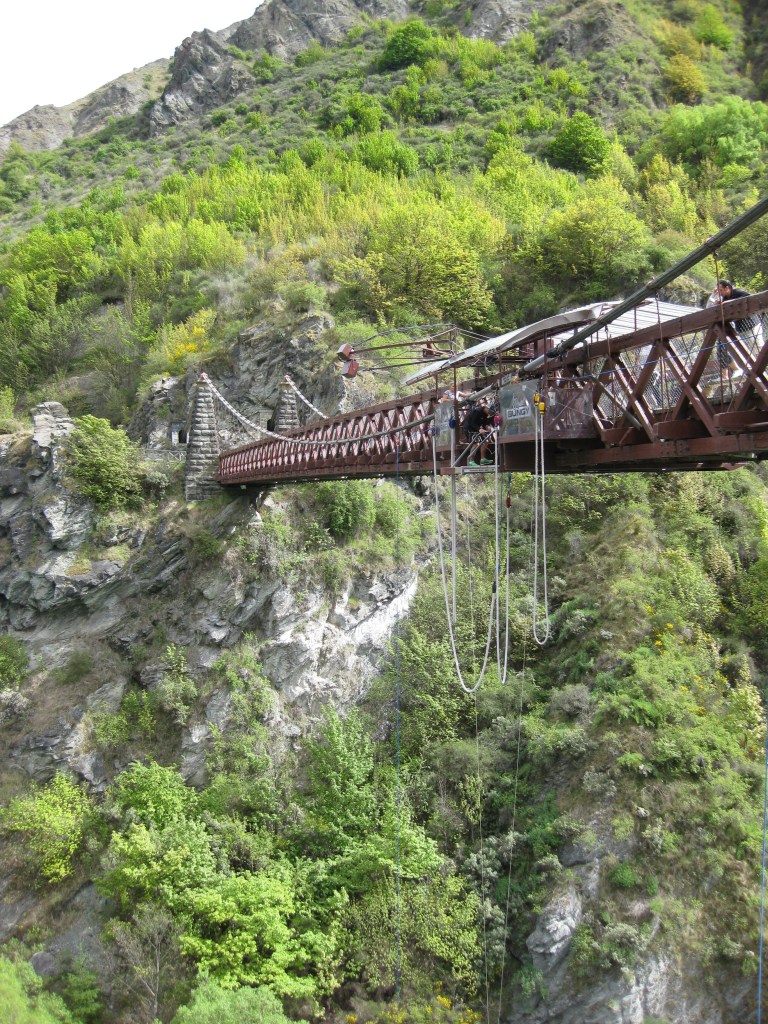 You’ll get to the Nevis via a little cable cart, because this bungy isn’t on a bridge, but a platform strung between two mountain peaks. While you wait for it, you can watch the others jump. I remember watching one man scream as he went off the edge. I promised myself I wouldn’t. The same poor guy didn’t manage to pull the release at his feet, so that he could swing himself upright after the bungee had settled. They had to pull him up by his feet, poor thing!